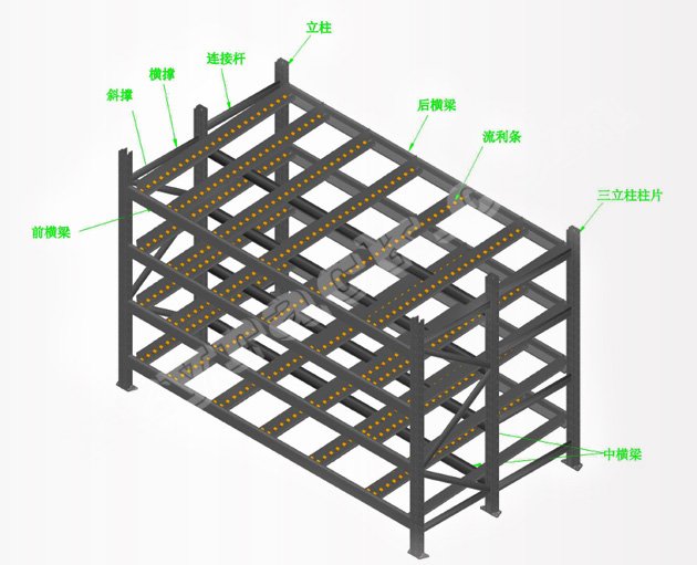 流利式貨架:采用輥輪鋁合金,鈑金等流利條,利用臺架自重實(shí)現(xiàn)先進(jìn)先出,存儲方便,適用于裝配線兩側(cè)配送中心等場所??膳潆娮訕?biāo)簽,實(shí)現(xiàn)貨物的輕松管理。將貨物置于滾輪上,利用一邊通道存貨,另一邊通道取貨,貨物在重力作用下向下滑動,在存放散貨時可很方便地為操作人員提供生產(chǎn)物品,加快生產(chǎn)流水線的工作速度,常用滑動容器有周轉(zhuǎn)箱,零件盒及紙箱,適合大量貨物和短期存放和揀選。