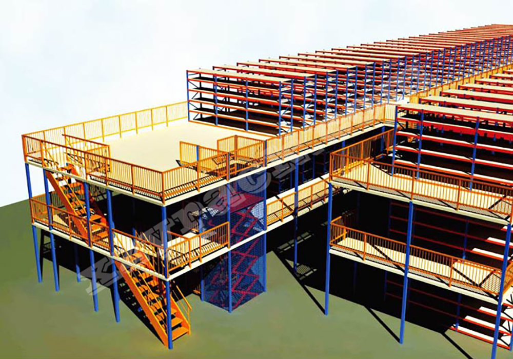 閣樓式貨架通常利用擱板式貨架或橫梁式貨架作為主體和樓面板的支撐,樓面板通常選用冷軋型鋼樓板、花紋鋼樓板或鋼格柵樓