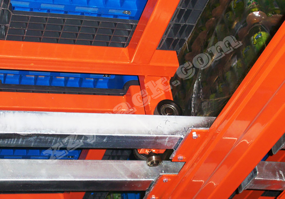 高密度存儲的貨架之一,適合少品種大批量貨物存儲。依據(jù)“先進(jìn)先出”的原則,托盤放置在運載臺車上依次延傾斜的軌道被后推至貨架內(nèi)部,有效深度一般4個托盤,取貨時第一個托盤提取后,下一個托盤自行滑至取貨點,尤其適合于倉庫單位面積造價較貴的倉庫,如冷庫等,安全性與運轉(zhuǎn)效率高于是駛?cè)胧截浖?,提高使用效率對于叉車操作要求比駛?cè)胧降停恍枰谕ǖ揽诓僮鳌?